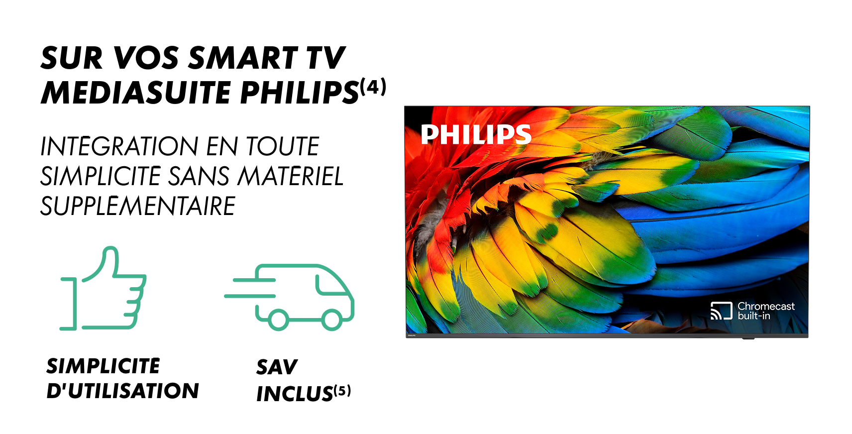 (5) La fonctionnalité Google Cast intégrée dans les TV MediaSuite PHILIPS permet une diffusion sans fil